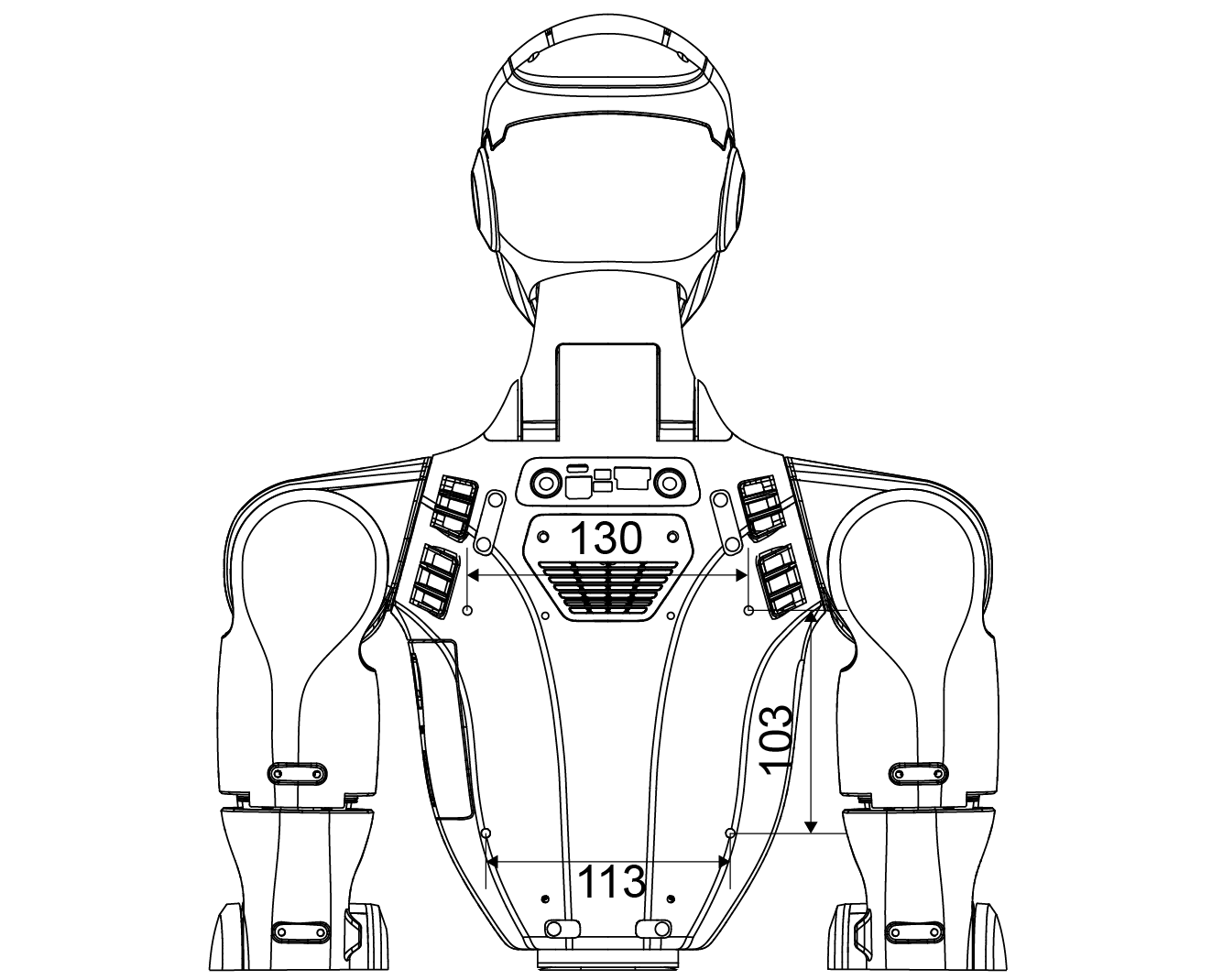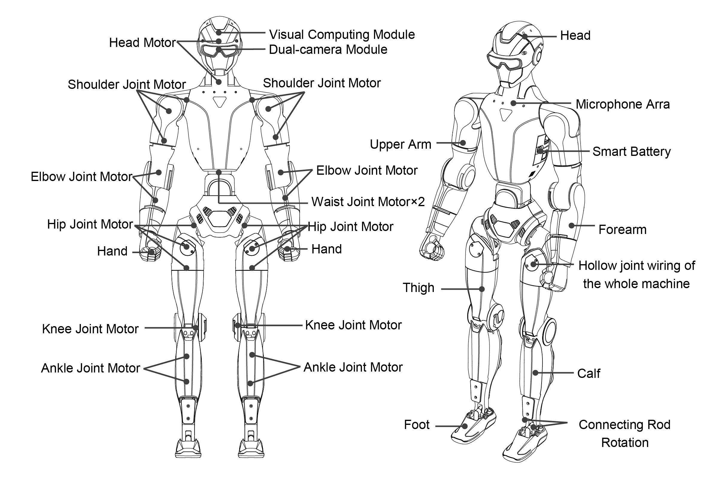 Each leg is designed with six degrees of freedom, incorporating the hip, thigh, knee, and ankle joints to ensure stable locomotion and adaptable movement. The arms are available in two configurations, providing either four or five degrees of freedom, including the shoulder, upper arm, and elbow joints. The Air variant features a simplified arm design with a reduced elbow configuration.