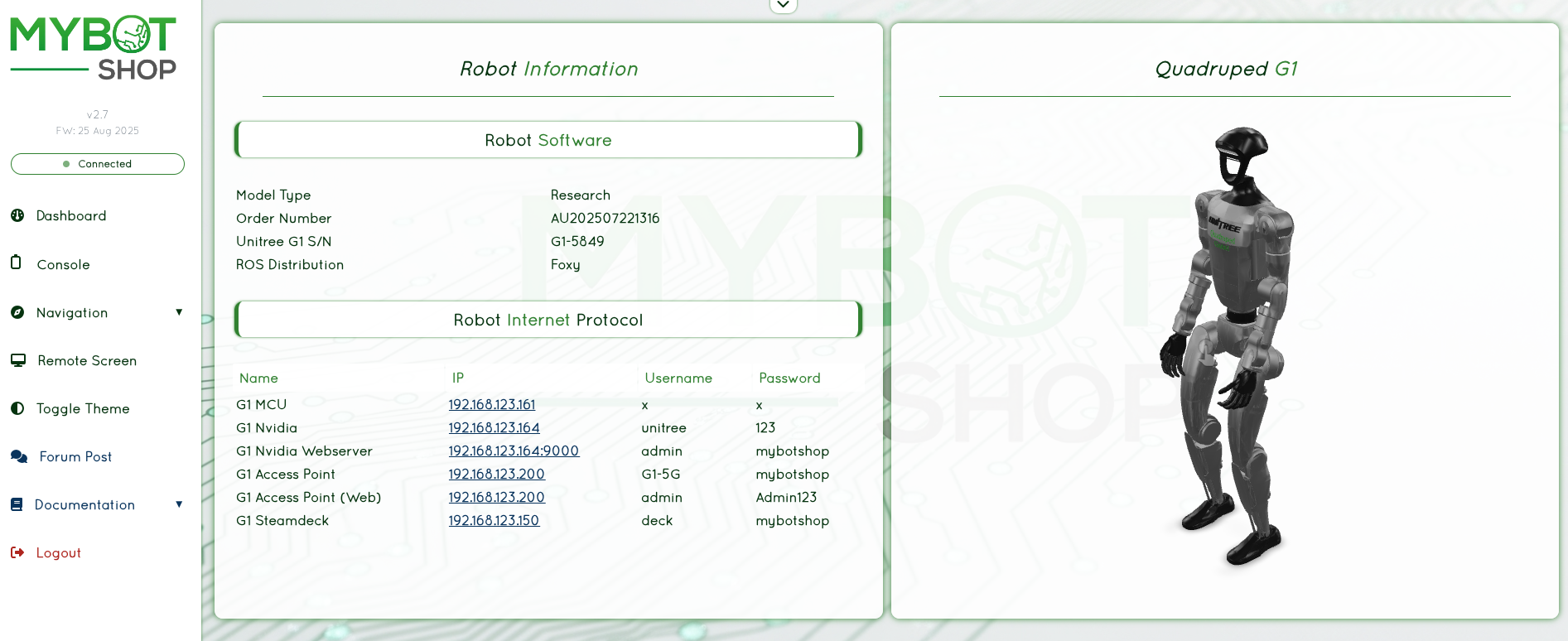 - All ROS2 drivers for the G1 developed by MYBOTSHOP operate with the environment variable ROS_DOMAIN_ID=10.