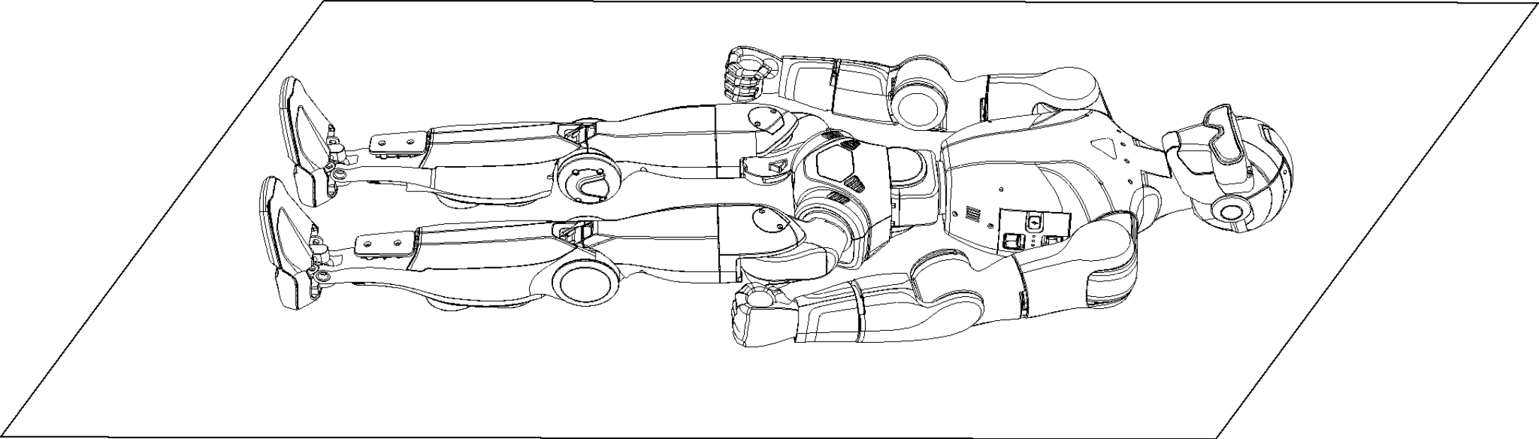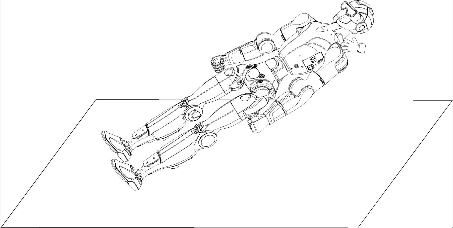 Before powering on, place the R1 flat on the ground with its front side facing upward. Ensure the surrounding area is clear of people and obstacles. Arrange the robot’s arms and legs in a natural, relaxed posture as illustrated in the reference figure.