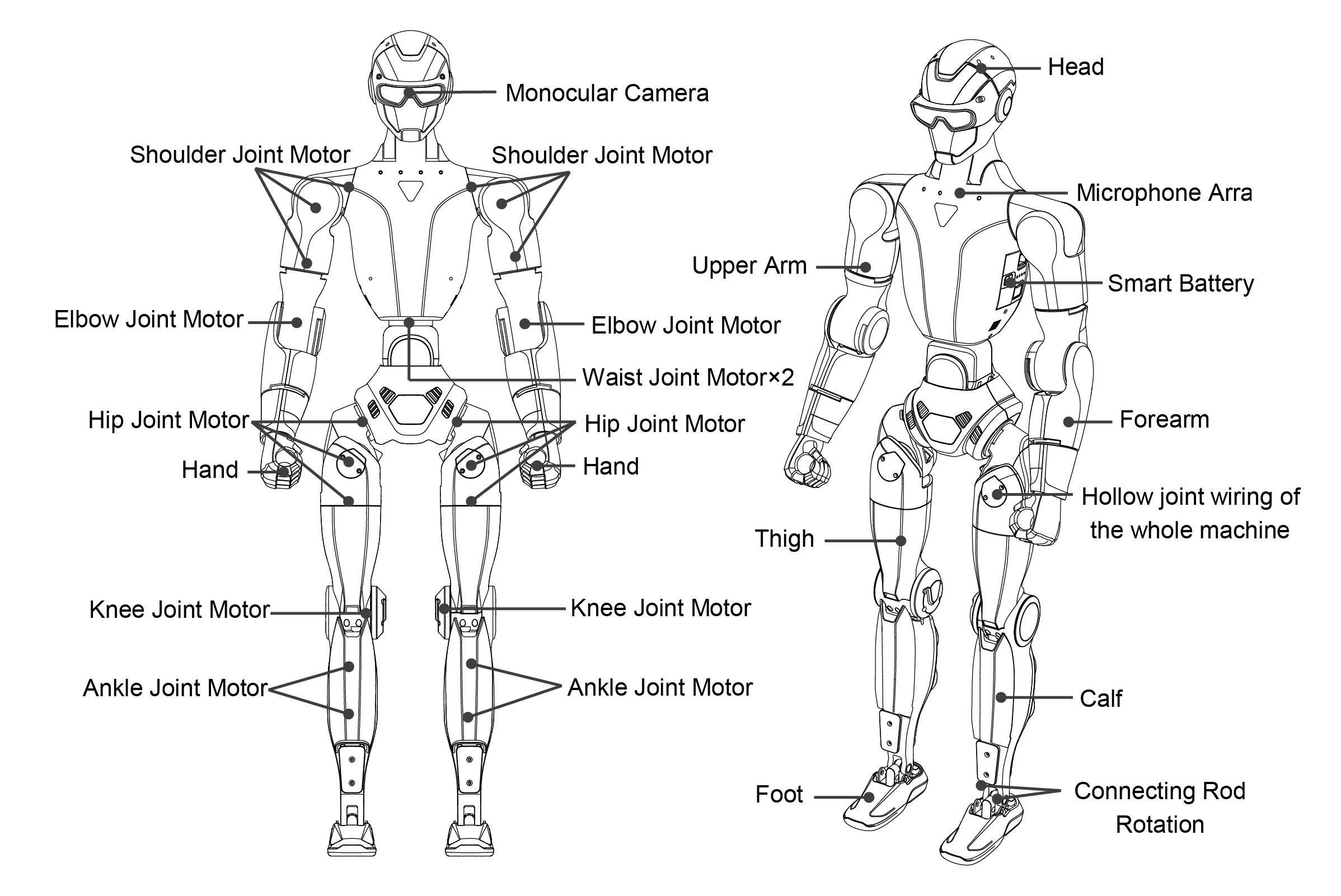 Each leg is designed with six degrees of freedom, incorporating the hip, thigh, knee, and ankle joints to ensure stable locomotion and adaptable movement. The arms are available in two configurations, providing either four or five degrees of freedom, including the shoulder, upper arm, and elbow joints. The Air variant features a simplified arm design with a reduced elbow configuration.
