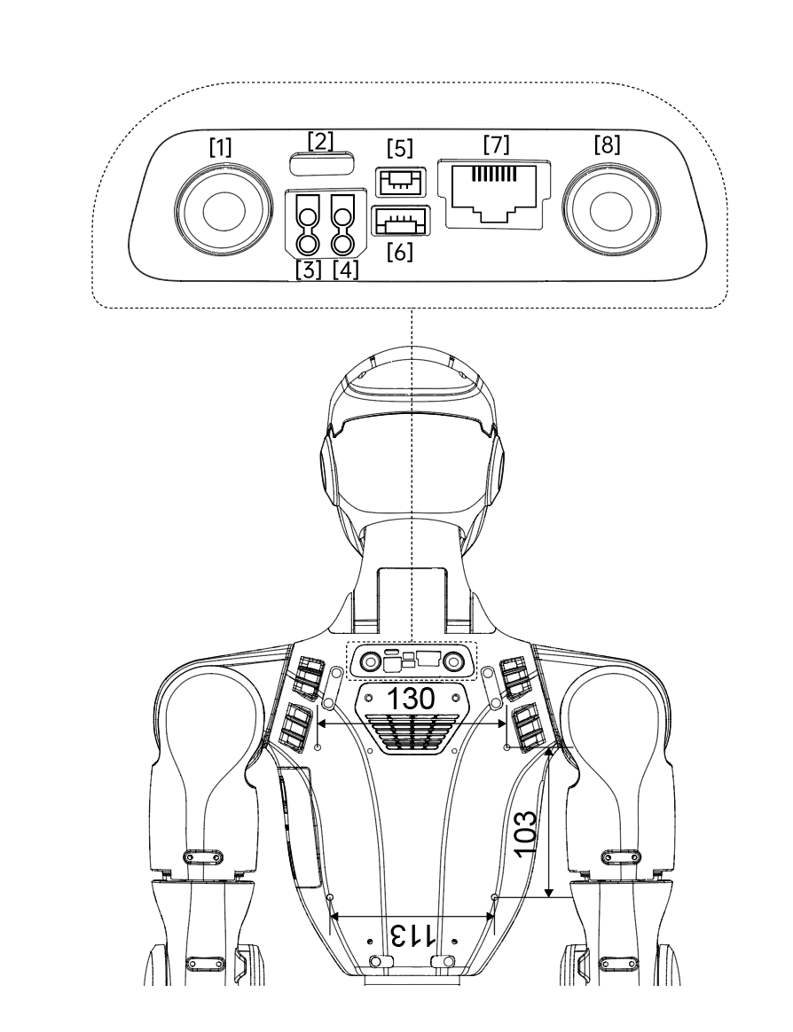 The upper section of the Unitree R1 is equipped with multiple electrical interfaces used to connect joint motors, sensor peripherals, networking equipment, and external control devices. This interface layout is designed to support convenient system debugging, fault diagnosis, and secondary development activities.
